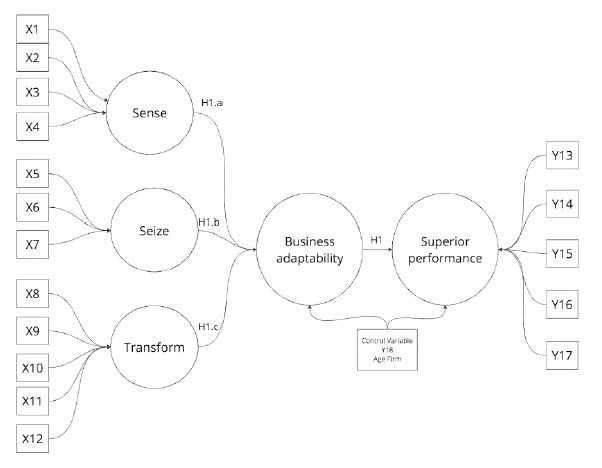 Gaviria-Marin et al. (2021) used the company's age as a control variable, which is essential because it is often associated with accumulating knowledge and experiences. Therefore, older firms typically possess established routines, deeper customer relationships, and more robust brand recognition. Thus, the company's ability to address rapidly changing environments can be observed through its longevity. The interplay between the age of the organization and dynamic capability influences the ability to strategize for sustainable success, ultimately correlating with superior performance (Chen et al., 2021). Some studies supporting the aforementioned include Lin et al. (2020), Mikalef et al. (2020), Zahra et al. (2006), and Eisenhardt and Martin (2000). The study's reflective model has three independent variables measuring business adaptability: Sense, seize, and transform; five items for superior performance as the dependent variable; and finally, the control variable, age firm (Figure 1).