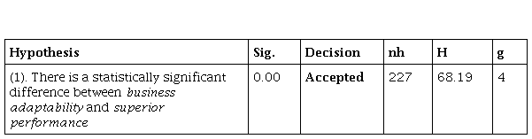 Hypothesis 1. There is a statistically significant difference between business adaptability and superior performance.