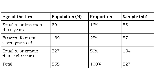 Finally, 555 (N) companies met the criteria for inclusion in the sample by substituting the literals of the formula for calculating the sample in a finite population; a sample of 227 (nh) was obtained, stratified by the control variable of the firm's age. The maximum allowable error was 5%, and the confidence level was 95%. (Table 1)