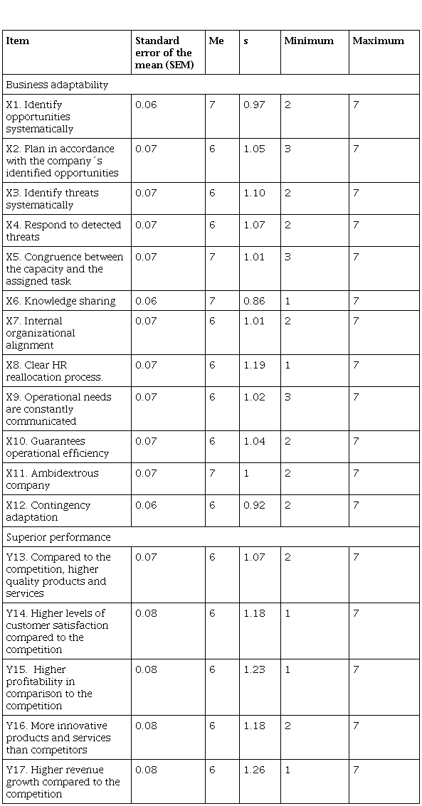 A non-experimental, exploratory, and cross-sectional study was designed for this research. Key informants included middle and senior managers of companies that hosted students from the Internship Program of the University Center between November 2021 and April 2022. The company's age was a control variable when calculating a stratified sample. Two hundred twenty-seven companies met the inclusion criteria, with a margin of error of 5% and a confidence level of 95%. A self-administered electronic survey was constructed using perceptual measures and distributed through emails from the University Center (CUCEA, 2021; 2022). Descriptive statistics and exploratory factor analysis were utilized to analyze business adaptability and superior performance, and the nonparametric test Kuskal-Wallis was chosen to test hypotheses.
