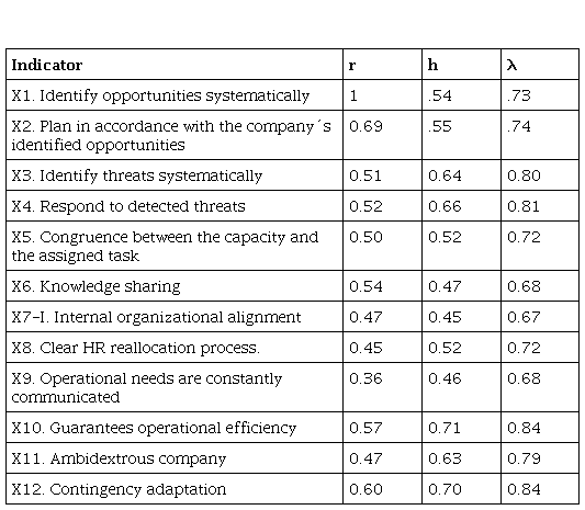 The exploratory factor analysis (EFA) results using the principal component method are presented in Tables 3 and 5. The Pearson correlation (r) ranges from weak to moderate for the company's business adaptability component and is crucial for superior performance items. The test of communality (h) reveals some indicators with values greater than 0.50, which are considered significant as they explain 25% of the variance, except for three items (X6, X7, and X9), which obtained values of 0.47, 0.45 and 0.46, respectively, the results of (λ), which represents the root of the eigenvalues, range between 0.67 and 0.84. It indicates that a significant amount of variance in the data is explained. Considering the value between weak and moderate correlation, the theoretical emphasis that seemingly insignificant factors can play a critical role in organizational adaptation and change in the effectiveness of dynamic capabilities (Belitski & Mariani, 2023;Apascaritei & Elvira, 2022; Camisón-Zornoza et al., 2020).