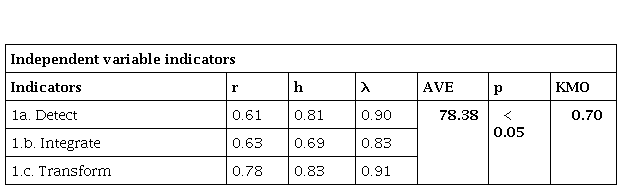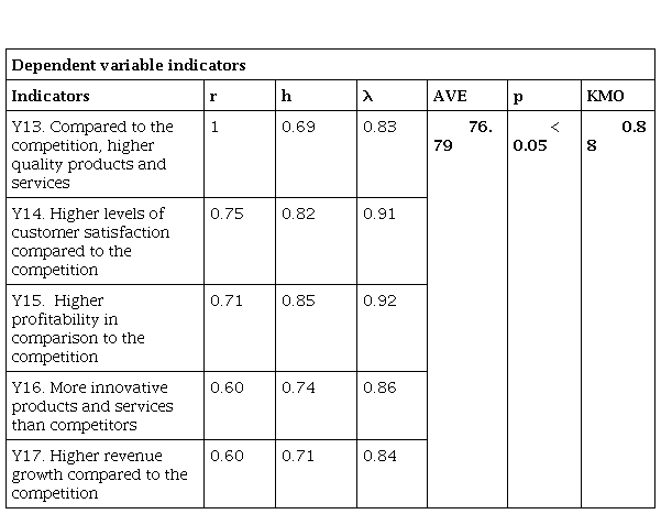 The results of the exploratory factor analysis for the dependent variable indicators are shown in Table 5. The Pearson correlation (r) is between 0.60 and 0.75, suggesting a substantial and coherent relationship between indicators. The h values between 0.69 and 0.85 indicate that the observed variables are well represented, which suggests adequate interpretability of the structure (Mavrou, 2015). The AVE was calculated while keeping the indicators consistent with the survey data. The AVE result for the dependent variable (Superior performance) was 76%, indicating that the variables can explain a significant amount of the total variability in the data. The Kaiser-Meyer-Olkin (KMO) result was 0.88, and the significance value (p) was less than 0.05. These results indicate that the EFA has identified a significant and reliable factor structure in the data, providing valuable insight into the relationship between the observed variables (Veliscer & Jackson, 1990).