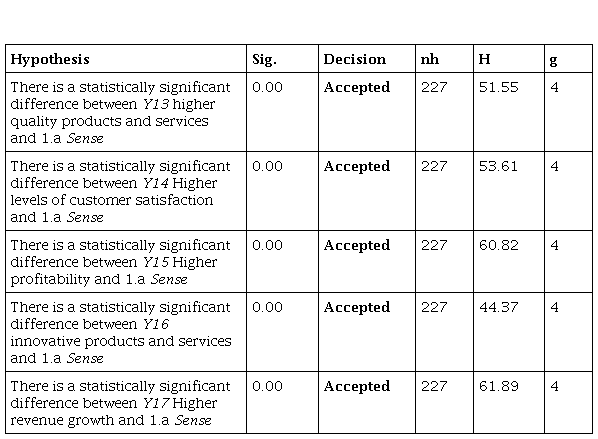 The results of Kruskal-Wallis statistics (Table 6) show that Sense and the distribution of superior performance indicators are statistically significant; an asymptotic relation between the groups is observed through the differences of the medians, the value of H is between 44.37 and 61.89. Hypotheses 1.a has been accepted, with statistically significant differences observed at a significance level < 5%.