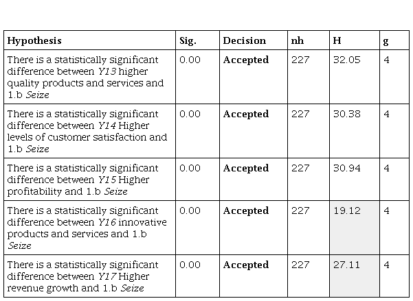 Analyzing the seize variable with the Kruskal-Wallis test exemplifies the challenge of operating and observing internal collaboration to gain a competitive advantage. Findings suggest that a more significant presence of the seize variable corresponds to a greater presence of superior performance indicators. It supports the affirmation made by Pavlou and El Sawy (2011) regarding the importance of synchronized work, sharing individual knowledge within the group, and the company's ability to implement changes (Kump et al., 2018). Hypotheses 1.b were accepted, with statistically significant differences observed at a significance level < 5%. Values suggest that higher quality products and customer satisfaction are both indicators of superior performance and are more representative; these indicators have the highest value of H. However, compared to the values of H from variable Sense and transform, seize has the lower values of H statistics. (Table 7)