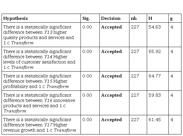Hypothesis 1.c have been accepted (Table 8), with statistically significant differences observed at a significance level < 5%. The results indicate a significant difference and an asymptotic relationship with the transform variable across all measures of superior performance, with an H-value greater than 50, four degrees of freedom, and a significance level inferior to 0.05. The superior performance indicators with the highest H value exhibit higher levels of customer satisfaction than the competition (H = 65.92) and Higher profitability (H = 64.77). It aligns with implementing renewal activities to achieve greater success than competitors in diversifying services, products, and processes to maintain superior performance (Kump et al., 2018). Transformation is a mechanism to ensure the company's permanence in the market despite having limited resources compared to the competition (Peng et al., 2022).