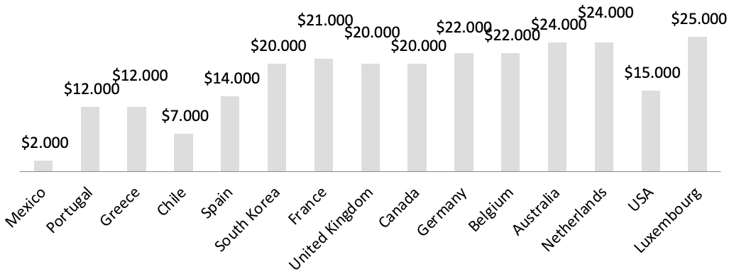 As Graph 4 shows, the actual minimum salary in Luxembourg is USD 25,000 per year in Purchasing Power Parity (PPP). In contrast, the minimum wage in Mexico is USD 2,000 per worker.