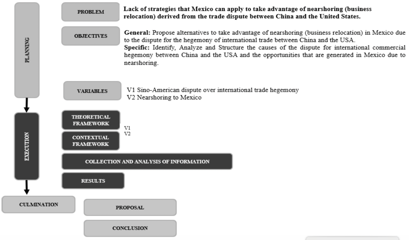For this purpose, a contrast was made between several reports in which the causes of the dispute for hegemony over international trade between China and the USA and the opportunities that business relocation to Mexico provides were analyzed. Based on this, Figure 1 shows the research method used to explain the behavior of the object of study and the corresponding variables.