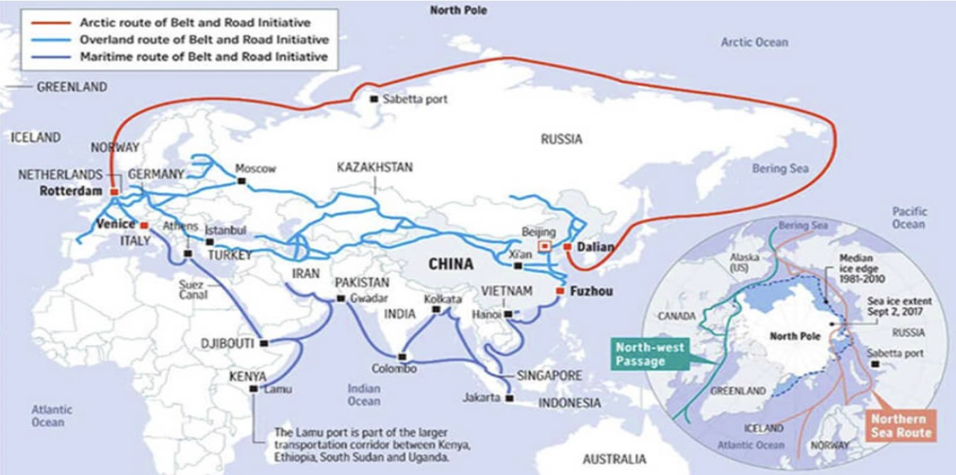 As shown in Figure 3, China has been developing strategic infrastructure such as seaports, airports, and highways in different countries to facilitate trade exchange. Three routes emerge maritime, land, and arctic. Highlighting the latter with a reduction in time, distance, and logistical costs, for example: