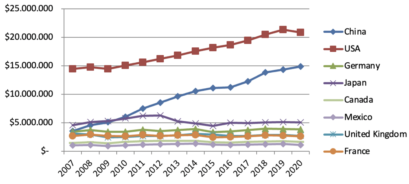 As shown in Graph 2, the USA has held the leadership for decades by serving as one of the most important economies worldwide without any competition. However, since 2011, China has had constant growth that has maintained the trend, which could replace the United States as the leading world power before 2030.