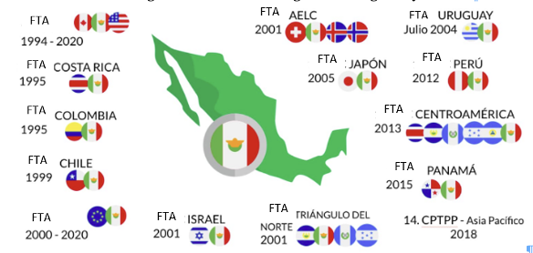 As seen in Figure 4, Mexico has 13 Free Trade Agreements (FTAs) with 46 countries. Likewise, it is affiliated with the Comprehensive and Progressive Agreement for Trans-Pacific Partnership (CPTPP) and the Pacific Alliance (PA). Therefore, Mexico is attractive for relocating foreign companies because they can access their goods in those countries with tariff preferences granted by the FTAs.