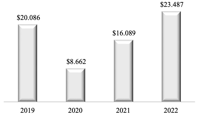 As shown in Graph 5, according to INEGI figures, between January and November, the inflow of tourist currency reached 23,487 million dollars, an increase of 3,300 million dollars more than previous numbers, due to the pandemic. Additionally, the entry of international tourists as of November 2022 remains 15.5% below pre-pandemic figures, that is, 40.31 million in 2019, 21.66 million in 2020, 28.18 million in 2021 and 34.07 million in 2022 (Munguía, 2023).