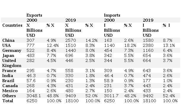 As can be seen in Table 1, in two decades, China has tripled its position in terms of exports worldwide with 14.2%, and not even the United States, Canada, and Mexico together equal the Chinese volume so we can see the loss of commercial supremacy of the United States. Moreover, regarding imports, China has become an increasing consumer market, from 2.6% in 2000 to 8.7% in 2019 globally.