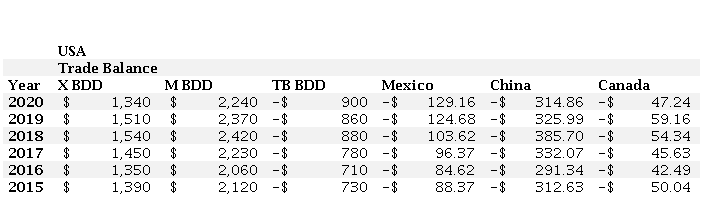 As shown in Table 2, the United States has had a general trade deficit (exports minus imports), and China has been the primary beneficiary of the trade exchange. It explains the interest of the North American government in reducing the trade deficit with the Asian giant by imposing tariffs of up to 25% on imports from China in 2018, in addition to reducing dependence on imports of strategic items such as microchips, for example. So many companies looked for a way to replace "Made in China" with "Made in Mexico." It is why Mexico resumed a strategic role promoted by the T-MEC (Free Trade Agreement between the United States, Mexico, and Canada) (Li et al., 2020).