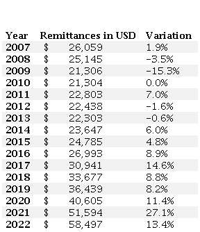 As shown in Table 4, Mexico has had historical records for the receipt of remittances, even in the pandemic years, in which annual increases were recorded, which compared to the years 2008 and 2009 had a reduction of -15.3 % due to the real estate crisis in the USA.