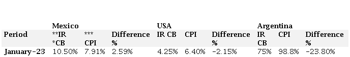 As shown in Table 5, the interest rates of the Central Bank of Mexico offered through CETES versus inflation give the national and foreign investor profits of 2.59% compared to the USA and Argentina as an extreme case, since they are countries in which it is not attractive to invest in the government due to the loss they generate.