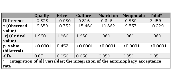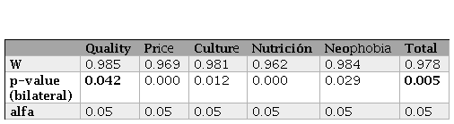 Following this, normality assessments were carried out to examine the data distribution. The data presented in Table 2 indicates the probability that all variables follow a normal distribution. Once this fundamental requirement is established, we can analyze the variables within both groups: the group that favors insect consumption and the group that does not, in addition to the experimental group, to identify any significant differences.