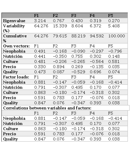 In addition to the acquired findings, a principal component analysis revealed that 80% of the variance is concentrated in two factors. Factor 1 (F1) demonstrates the lowest factor load in the price variable. In contrast, the second factor (F2) shows the highest factor load in this variable, implying that F2 is mainly influenced by price, accounting for 15.4% of the variance. This confirms that the price variable does not act like the other variables and does not hold significant importance in consumers' decision-making regarding insects. Consequently, all variables, excluding price, exhibit noteworthy influence concerning eigenvalue, owner vectors, and factors loading for F1, as indicated by their correlation with F1 (Table 4).