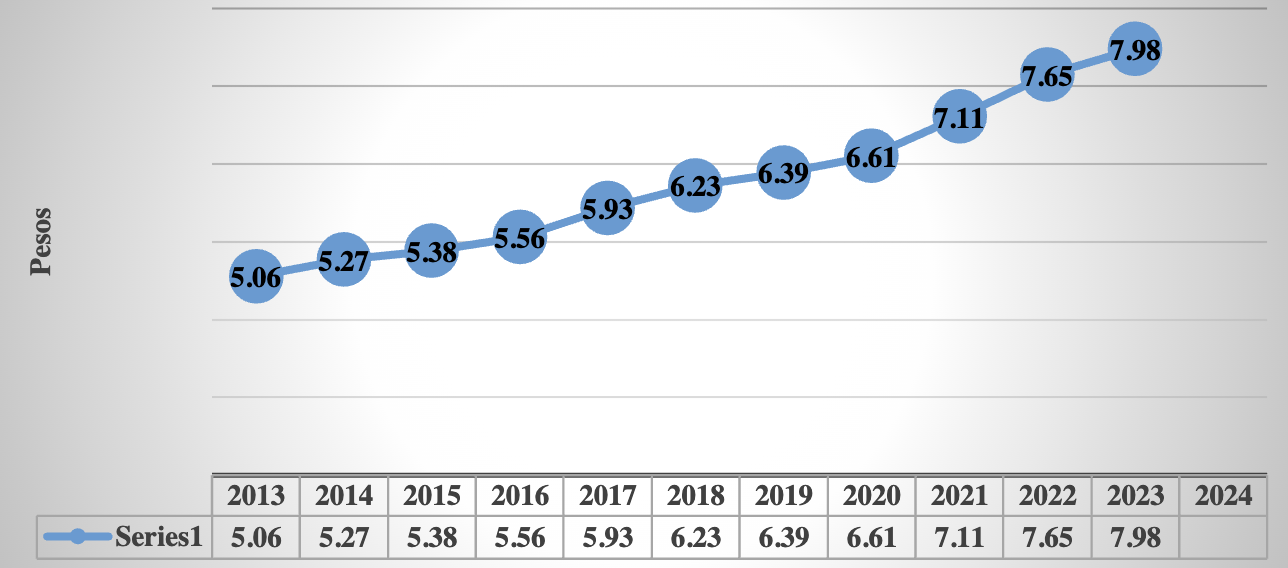 It is the value of the Mexican peso relative to the dollar calculated using the daily average of the five most important banks in the country. It reflects the spot price (cash) negotiated between banks. It is highly related to Inflation, the interest rate, and the Mexican Stock Exchange.