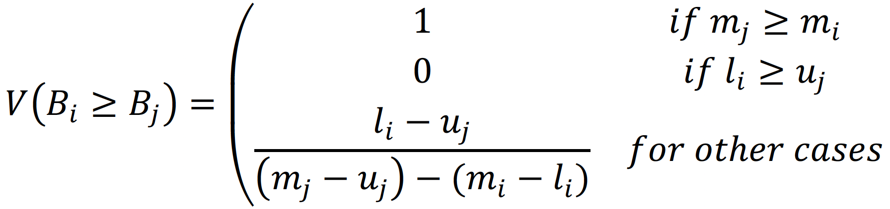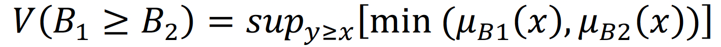 In this stage, the comparison process is applied as part the methodology used by Naghadehi et al., (2009) to analyze the importance of the factors. Accordingly, the factor B1= (l1,, m1,, u1), expressed as a fuzzy set, is compared with 𝐵2 = (𝑙2,𝑚2, 𝑢2), applying equations(6) and (7) and so on with the rest of the factors.