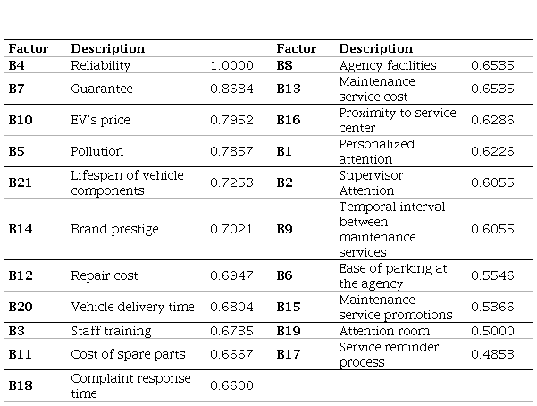 Based on the methodology proposed and according to stage 2, the weight of each of the 21 factors influences customer happiness. It has been discovered that, when considering aspects in isolation, the reliability component is most important in enhancing the enjoyment of electric car consumers in Mexico. The guarantee factor is closely followed, while the pricing factor ranks third in importance. In contrast to prevailing assumptions, pricing does not hold paramount significance. This is likely because electric vehicle prices are predominantly regarded within the upper economic range. As a result, the user prioritizes other variables, such as reliability, as more significant in determining their level of enjoyment (Table 5).