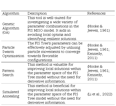 · The Tress FIS underwent two tuning processes. The first phase involved learning new rules using Particle Swarm Optimization (PSO), while the second step involved modifying the parameters of the FIS Tree using the Pattern Search Method.
