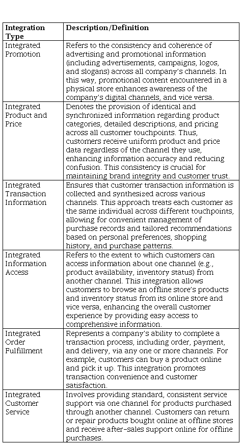 Scholars characterise channel integration as a six-dimensional construct: integrated promotion, integrated product and pricing, integrated transaction information, integrated information access, integrated order fulfilment, and integrated customer service (Oh & Teo, 2010; Lee, 2020; Gao et al., 2021) (Table 1).