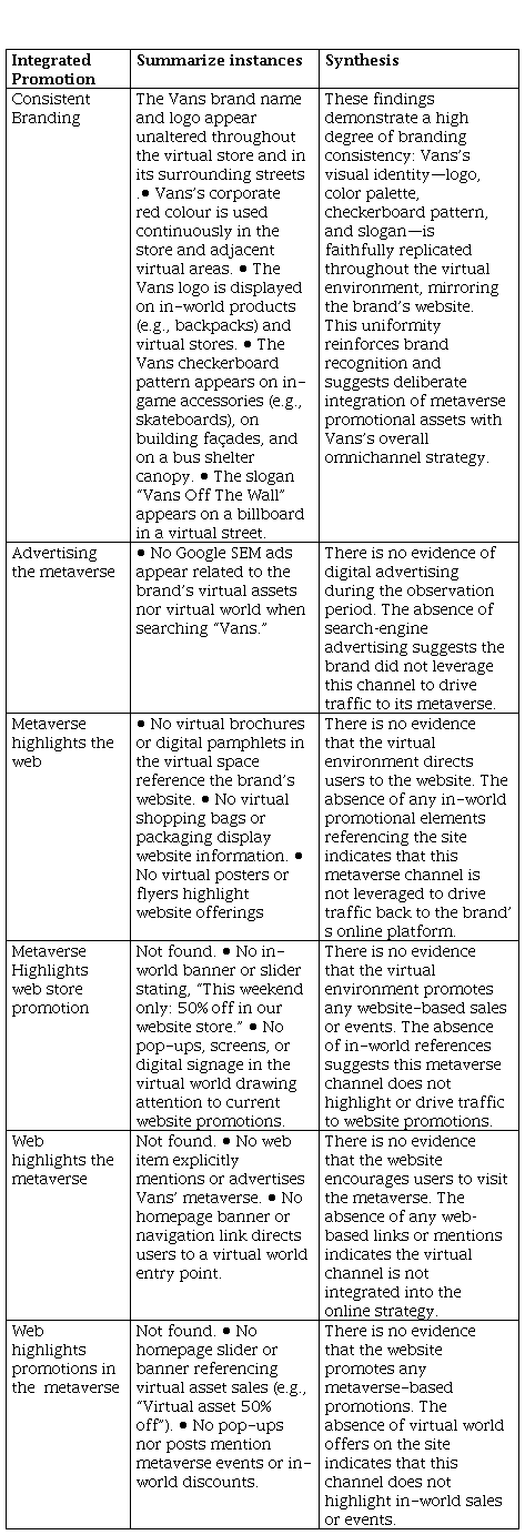 To determine whether and how the metaverse functions as an integrated channel, observations were coded against an established channel‐integration framework. Each dimension was operationally defined based on Oh and Teo (2010) and Gao et al. (2021). A detailed codebook defined each code and provided decision rules. Coded data were then aggregated to identify which integration dimensions were present in the metaverse environment and compared against the brand’s website.