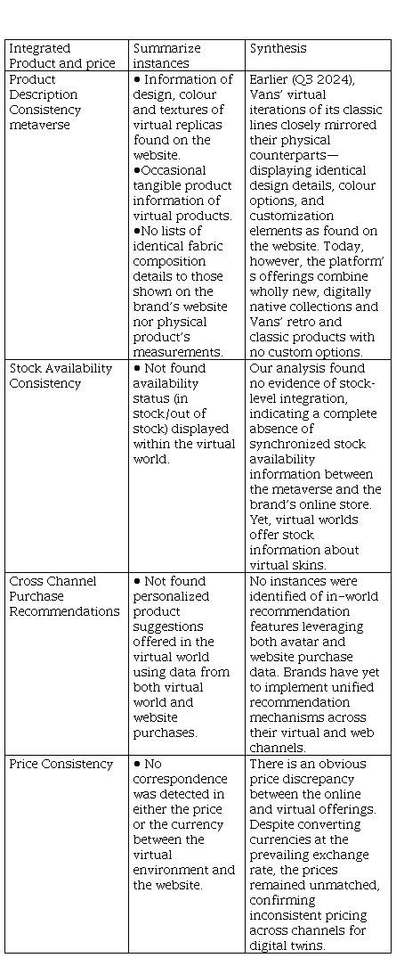 Vans’ metaverse environment disclosed a lack of integration with the brand’s website—and vice versa. Specifically, metaverse and website purchase histories remain siloed; recommendation engines do not synchronsze; search and stock-check functions in the metaverse do not surface real-time website availability. The website offers no access to metaverse catalogues or promotions; virtual coupons cannot be redeemed online, and no returns for website orders can be initiated in-world. The website’s support portal excludes virtual-world purchases, and there is no live-chat connection to in-world customer-service avatars. In sum, the metaverse and web environments operate as isolated silos concerning all tested forms of transactional and service integration. This result is consistent with Akter et al. (2021), who point out that the metaverse is not capable of offering personalised offers, location-based promotions, or one-to-one communication (Akter et al., 2021).