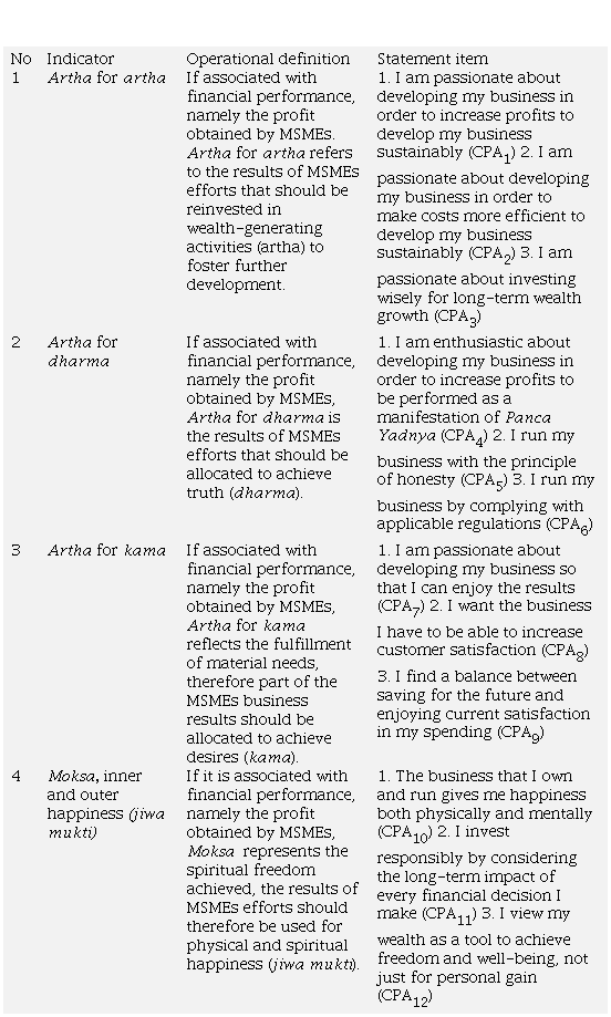 The CPA culture is the primary teaching in Hindu philosophy, which consists of four goals for human life. These four dimensions are interconnected in forming an ideal balance of human life. The agreement obtained yielded the following indicators, operational definitions, and statement items, as shown in Table 1.