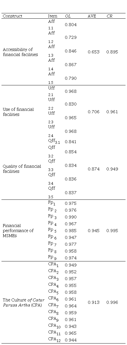 Outer model analysis was conducted to ensure that the measurement was appropriate for use. Measurement model testing shows convergent and discriminant validity. If the reflexive correlation exceeds 0.70, it is considered high. However, for early-stage research in scale creation, an external filling value of 0.5–0.60 is considered sufficient (Chin et al., 2003).