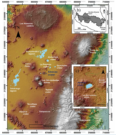 Therefore an axalapazco is a crater lake that forms in a volcanic crater or caldera, such as a maar. Atexcac, in strict sense, is an axalapazco as it has a beautiful emerald-colored lake inside. The Atexcac axalapazco is located in the central part of the Serdán-Oriental basin in the eastern Mexican Volcanic Belt ( Figure 1a and 1b ). The Serdán-Oriental basin is dotted with several volcanic structures such as basaltic cinder cones, rhyolitic domes ( Riggs and Carrasco-Núñez, 2004 ; Carrasco- Núñez and Riggs, 2008 ; Zimmer et al., 2010 ) and about a dozen of maar volcanoes of either basaltic ( Carrasco-Núñez et al., 2007 ; Ort and Carrasco-Núñez, 2009 ) or rhyolitic ( Austin-Erickson, A., 2007 ; Austin-Erickson et al., 2008 ; Zimmer et al., 2010 ; Austin-Erickson et al., 2011 ;) composition. The Atexcac axalapazco has an elliptical shape in map view ( Figure 1c ) with maximum axes between 1,150 and 850 m, being the largest dimension oriented in the ENE direction. Carrasco-Núñez et al. (2007) demonstrate that the Atexcac axalapazco was formed as a result of intense phreatomagmatic explosions revealing strong fluctuations in the availability of external water, temporal migration of the locus of explosions and periodic injection of magma.