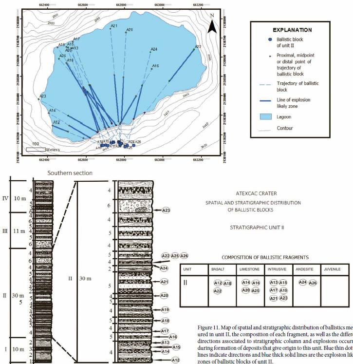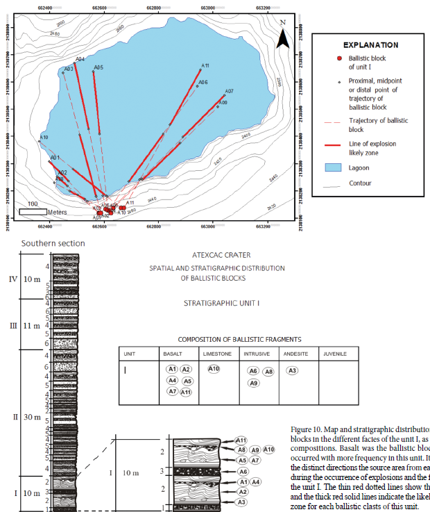 In order to have a general and rough estimation of the source of the ballistic blocks originated during phreatomagmatic explosions, it is important to have a general stratigraphy of the country rock, underneath the Atexcac axalapazco, even if we consider that the blocks travel directly from the source or, more likely, they mix during the vertical travel to the surface to finally erupt from shallower levels ( Valentine and White, 2012 ). In addition to the rocks exposed on the Atexcac crater´s walls (basalts), other non-exposed rock units such as limestone, andesite and microdioritic rocks has been inferred to exist at relatively shallow locations underneath the volcano based on the abundance of these clasts in the maar-forming deposits ( Carrasco-Núñez et al., 2007 ). Even though some clasts may be recycled during multiple explosions ( Ross and White, 2006 ; Valentine et al., 2011 ; White and Ross, 2011 ).