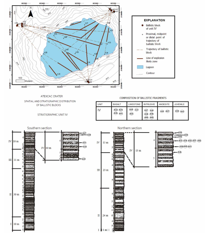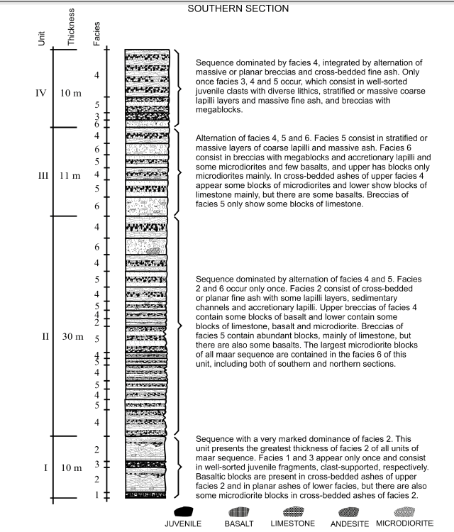 We have no data of ballistic projectiles of unit III, neither the southern or northern sectors, but differences between existent facies on type and thickness, indicate some explosions were closer to the southern zone. The presence of breccias with megablocks (facies 6) at both sectors intercalated with ash layers with accretionary lapilli and juvenile ash, suggests explosive phases alternated with phreatomagmatic and magmatic events. These explosive events may have fractured the aquifer allowing subsequent intermittent interaction of magma bodies with groundwater and then generating later, either breccias with cross-bedded layers (facies 4) or breccias with massive ash (facies 5) perhaps associated to opening of a news explosive source. Also, these events could have produced abundant ballistic blocks of facies 6, mainly of basaltic, limestone and microdioritic composition. For example, the greater thickness of facies 4 and 5 of lower and the middle parts of unit III at northern section could suggest a closer explosive source.