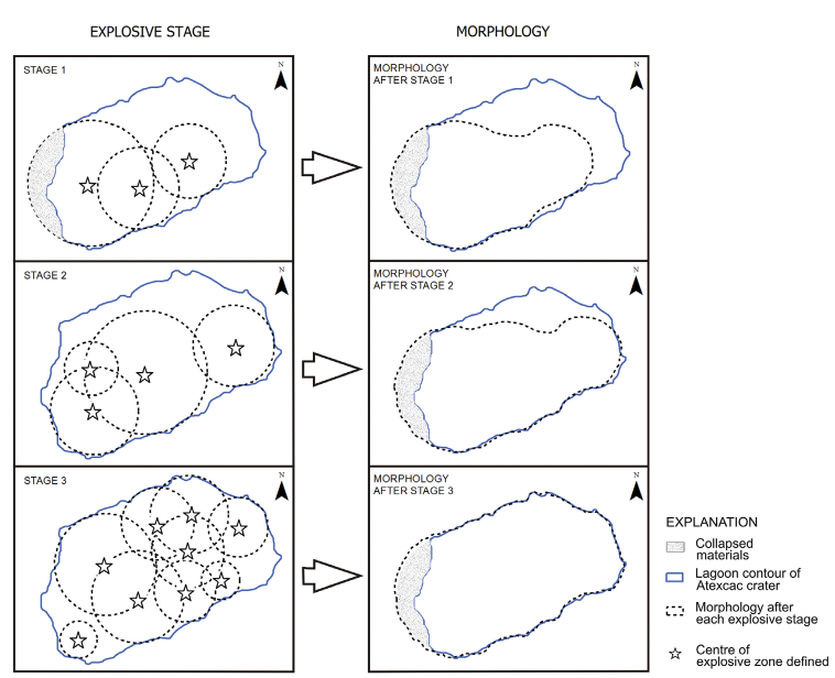 In order to explain the evolution of the crater morphology we propose three explosives stages. An initial eruptive stage probably associated to the protodiatreme development ( Valentine and White, 2012 ; Ross et al., 2013 ) whose explosions occurred mainly along the southwest sector of the inner crater, followed by the eruptive stage 2 that caused crater widening to the northeast and a final eruptive stage with simultaneous and alternated explosive locus, producing facies deposits and ballistic blocks of various compositions that reflect a vertical mixing before ejecting of these blocks ( Valentine and White, 2012 ; Valentine et al., 2014 ), which in general originated the current morphology of crater.