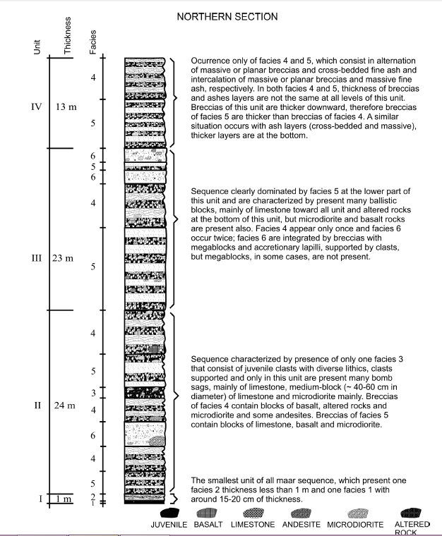The alternation of these layers and the diverse composition of the ballistic blocks (basaltic, limestone and microdioritic rocks) in facies 4 may indicate that explosions in the explosive stage 2 occurred at different depths and that there was intermittent availability of water that produced cross-bedded layers (with accretionary lapilli) intercalated with fallout breccias. However, it can also be associated to the occurrence of intra-diatreme explosions, at various levels, whose products were finally ejected through explosions derived from near-surface explosions ( Valentine and White, 2012 ). These breccias could be associated with events when water of the local aquifer was not abundant or was not sufficient to induce explosive interactions with an ascendant magma body. The explosive events of stage 2 were not present at the northern section perhaps due to the closeness to the source. When surges and fallout finished, the eruption evolved to a more magmatic behavior, shown by alternated layers of coarse lapilli breccias and juvenile ash fallout layers. At this stratigraphic level, the explosive locus migrated to the crater´s southeast sector and explosion locus could have been at different levels ( Ross and White, 2006 ; Valentine et al., 2011 ; White and Ross, 2011 ) and these explosions produced the first facies 5 of unit II bottom at the crater´s northern sector. The eruption continued with same intermittent behavior that is an alternation of explosive locus localized at the northern, southern and northwest of the crater. This stage 2 includes facies 4 and 5 at the southern sector with different thicknesses and the presence of microdioritic, basaltic and limestone blocks, could means that explosions occurred to different depths with intermittent availability of groundwater without producing long-lasting explosive interactions. In this same stage 2, the explosions caused the deposit of the first breccia characterized by containing larger microdioritic blocks (facies 6) at northern sector that