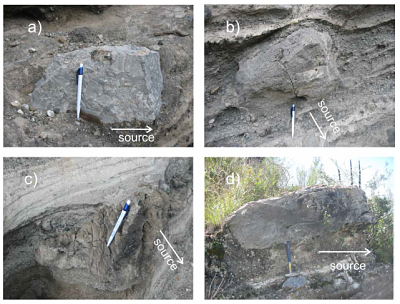 The phreatomagmatic explosions may originate large ballistic fragments of the country rock or fresh magma ( Self et al., 1980 ; White and Schmincke, 1999; Németh et al., 2001 ; Lorenz, 2007 ; Kereszturi and Németh, 2012 ; Jordan et al., 2013 ), which exit to the atmosphere with parabolic-to-hyperbolic trajectories, due to the resistance that offer the air when the fragments are transported through the atmosphere ( McGetchin et al., 1974 ). Bomb sags are good indicators of the source area of the ballistic clasts, however, in many cases, the deposition surface was composed of either coarser grained pyroclastic deposits or it was not wet enough to deform plastically upon impact of ballistic blocks at the Atexcac axalapazco, therefore we consider also some other conditions to infer ballistic trajectories. We only take into account ballistics with elongated shape because ballistic projectiles are ejected from the explosive locus following a general parallel trajectory along its larger diameter, however they may turn around along this axe during transport. Thus, the projectile will remain with its major axis on direction of its trajectory, this is especially true for large blocks, travelling short distances as observed through videos on different volcanoes ( Waitt et al., 1995 , Taddeucci et al., 2012 ), thus we consider mostly big elongated lithic (dense) blocks, which are considered to be less affected by modifications of their travel in the air, than small or equidimensional blocks.