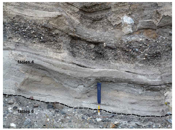 Unit IV The upper unit IV is 10 m thick and 13 m in the southern ( Figure 3 ) and northern sections ( Figure 4 ), respectively. There is a difference in facies 3 and facies 6, both with 0.5 m thick, two facies occur in the southern section. In addition to facies 4 deposits, 7m-thick facies 5 deposits appear in northern section.