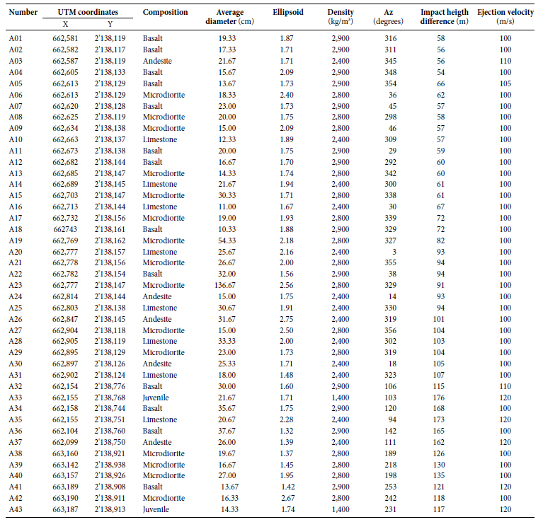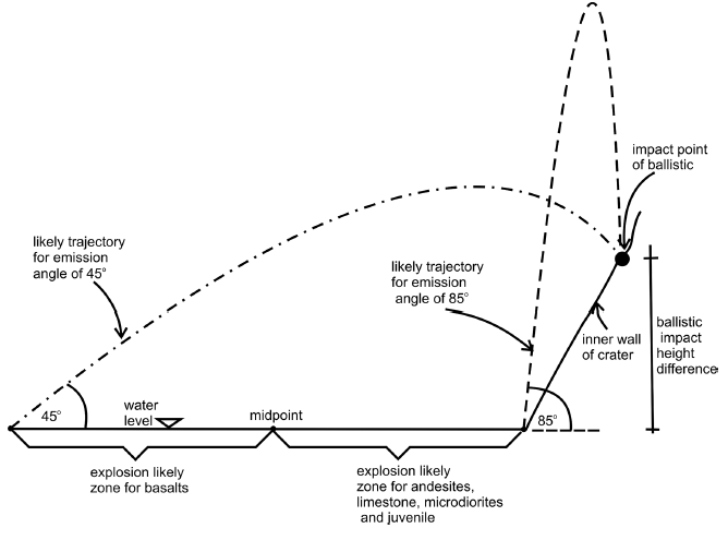 modeling was performed through the Eject computer program, version 1.4, developed by Mastin (2008) . The input data used for the modeling for each projectile launched were: a drag coefficient of 0.3 (for all modeling), the density of the projectile according to the type of rock that is composed (basalt, andesite, microdioritic, limestone, etc; see Tables 2 and 3 ), the diameter of the projectile (obtained as the average diameter of the larger diameter, medium and low), the ballistic emission angle, ejection velocity and the ballistic impact height difference. Alternately the Eject and Excel programs were used to determine, in each modeling, the farthest point of where likely come from each ballistic, using an angle of 45° ( Figure 8 ); of the same way the closest point was obtained of which could be from the same ballistic, considering emission angle of about 85°. Then the midpoint between these two points was determined and defined two zones along the line trajectory of the fragment; a more proximal likely zone of ballistic ejection, between the middle point and the emission point considering the angle of 85 ° ( Figure 8 ), that is, we estimate a maximum and minimum travel distance that suggest a likely range regardless the variation of the ejection angle. Judging by the stratigraphic position at the subsurface inferred by Carrasco-Núñez et al. (2007) from the different lithologies identified in the maar-forming stratigraphic columns, we consider that a zone is more likely for the ejection of limestone, andesite, microdiorites and juvenile blocks, inferring that ballistic blocks with these compositions may come from zones that are not exposed and underlie the basaltic rocks that are exposed at the bottom of the crater at the level of the lake. However, these lithologies that form the underground country rock doesn´t have to be too deep, we can estimate a few hundreds meters but less than 1 km. Therefore, it may be possible that those blocks come from relatively shallow depths and/or some might come from even shallower near-surface explosions, as a result of vertical mixing of material derived by upward-directed debris jests and downward collapse, as proposed by Valentine and White (2012) . It may be likely that the ejection of basalts that are exposed just at the level of the crater, may result from direct ejection.