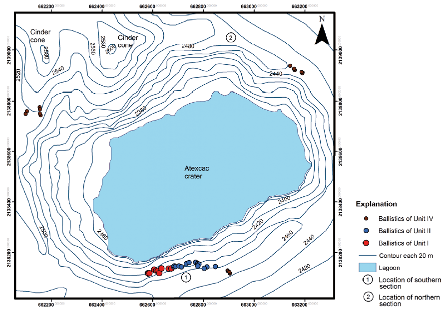 In order to describe the maar sequence of Atexcac axalapazco two stratigraphic sections were considered: a) a southern section ( Figure 3 ) with the best exposure of facies and better access and, b) a northern section ( Figure 4 ) that served to correlate the occurrence of ballistic fragments during the evolution of Atexcac volcano. To explain the maar sequence we present a description of the six facies defined (see description of facies in Table 1 ) and the four units containing such facies.