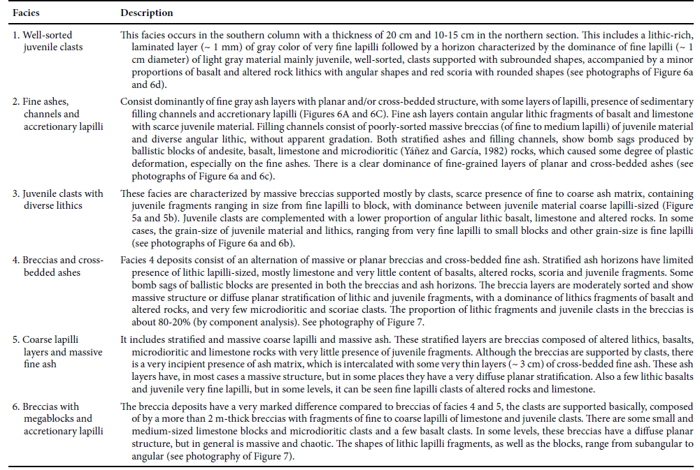 In general, the facies 4 and 5 are the most abundant in the southern and northern sections; that only show differences on their grain-size distributions. Facies 1 deposits, are only present once, at both southern and northern sections. Facies 2 deposits appear twice in the southern section and only one at the northern section. Facies 3 deposits appear twice at the southern section: the lowermost stratigraphic unit I and the uppermost stratigraphic unit IV occur once at the northern section. Facies 6 deposits are present both at the southern and the northern sections in similar proportions ( Figures 3 and 4 ), but facies of unit I are thinner. In deposits of facies 6 in both sections, occur abundant ballistic blocks of diverse compositions.