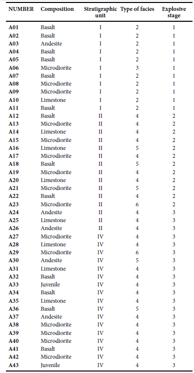 The first basaltic ballistic blocks of the explosive stage 1 (A1, A2 and A4) suggest two alternate and sub-surface explosive locus acting at the southwest and northwest zones, producing surge layers of the lowest facies 2 of unit I. The lapilli-size and minor blocks of the juvenile-rich material of facies 3 together with the orientation of a microdioritic ballistic block show likely magmatic explosive pulses that occurred at the southern sector of crater, at relatively deeper levels that previous events, either as direct ejecta or as stepwise ascent to the surface. A new injection of basaltic magma generated explosive interactions with water of local aquifer producing coarser-grained surge layers of the upper
