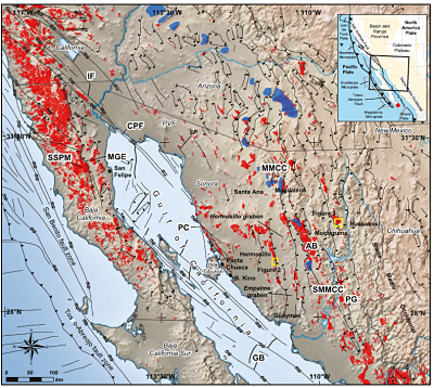 Henry, C.D., Aranda-Gómez, J.J., 1992, The real southern Basin and Range: Mid- to late Cenozoic extension in Mexico: Geology, 20, 701-704.
