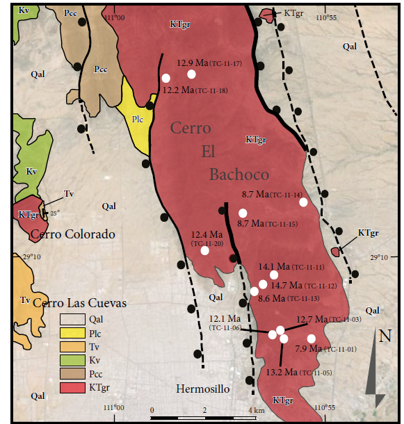 Cerro Bachoco The Cerro Bachoco is located at the longitude of 111° W, towards the northeast of the city of Hermosillo (Figure 2). It consists exclusively of granodioritic rocks belonging to the Hermosillo batholith, with a medium-grained equigranular holocrystalline texture. Granophyre stocks, commonly with perthitic texture, intrude the granodiorite. Contrarily to the adjacent areas, for example in the southeast of Hermosillo, in the Cerro Bachoco no Paleozoic or Mesozoic host rocks are present. A hornblende 40Ar/39Ar step-heating age for a sample collected south of the Cerro Bachoco yielded a mean age of 61.51 ± 0.33 Ma (Valencia-Moreno et al., 2006), which confirms previously reported hornblende and biotite K-Ar ages of 62.9 ± 1.5 Ma (Damon et al., 1983), and 64.9 ± 1.3 Ma (Mead et al., 1988). At the Cerro El Yeso, located 15 km south of Cerro Bachoco, plutonic rocks are overlain by sandstone, siltstone, and conglomerate likely correlative to early Miocene Báucarit Formation. These sediments are covered by volcanic rocks, including a basal black to brown vitrophyre and eutaxitic ignimbrite, which corresponds to the 12.5 Ma old peralkaline ignimbrite that is widespread on the hilltops to the west of Hermosillo (Vidal-Solano et al., 2005). Sediments of the Báucarit Formation are tilted with an average of 30° to the west or southwest, whereas the ignimbrite is tilted 17° to the west, which suggests a progressive tilting during early to middle Miocene, but we cannot reject the possibility of an original dip for the ignimbrite. West of the Cerro Bachoco, along the western foothill of Cerro Colorado, the same peralkaline ignimbrite overlies the intrusive rock with a dip of 25 to 33° to the east. Unfortunately, the sample of the Cerro Colorado did not contain apatite and no AFT age was obtained, but we can conclude that the eastern flank of the Cerro Colorado was completely exhumed at 12.5 Ma.