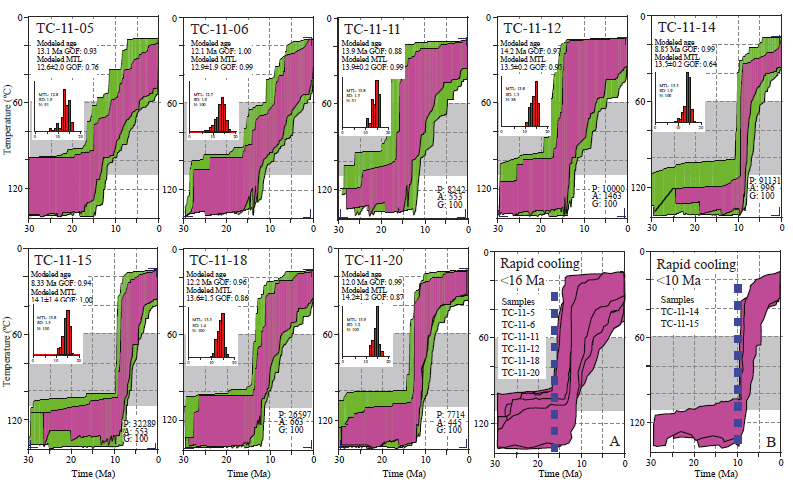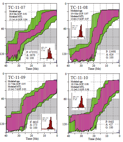 In the central part, three samples were collected (TC-11-14, TC-11-15 and TC-11-20). The AFT ages are from east to west 9.7± 1.3 (TC-11-14), 8.7 ± 0.6 (TC-11-15), and 12.4 ± 1.1 Ma (TC-11-20). MTL are respectively 13.55 ± 0.14 μm (SD = 1.39), 13.82 ± 0.13 μm (SD = 1.33) and 13.89 ± 0.12 μm (SD = 1.21). AFT thermal modeling for these three samples suggests relatively rapid cooling within the partial annealing zone (PAZ) at the time corresponding to the AFT age.