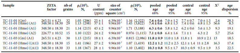 Zeta values; ρ and N: Fossil (f) and induced (i) track densities and number of fossil (f) and induced (i) tracks counted; P (X2) Probability of obtaining a X2 value for v degrees of freedom, with v = number of counted grains - 1; ρd and Nd: track density for the fluence glass monitors and number of tracks counted; SD: Standard deviation of the confined track length distribution. Coordinates are in Universal Transverse Mercator system. In the case of the P (X2) failed with values < 5%, the central age is used, instead of the pooled age. The central ages are in italic in the table. The Zeta value used for TC-11-01 is 226.77 ± 10.52. For the others samples, the Zeta value is 265.51 ± 4.23. X: No data available.