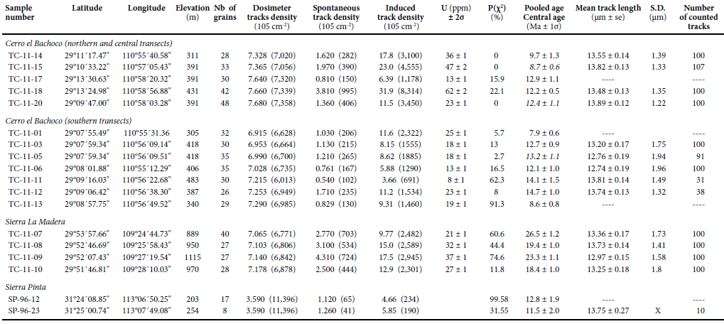 The present study is one of the first attempts based on apatite fission-track analysis to better constrain the evolution of structures and the tectonic schedule within the extensional province of northwestern Mexico. Results yielded new findings on the thermal behavior of plutons during Cenozoic extension and in some cases also for Late Cretaceous time. This large geographic distribution allowed enlightening some of the thermo-tectonic problems related with extensional tectonics of northwestern Mexico, which can be useful for future detailed studies.