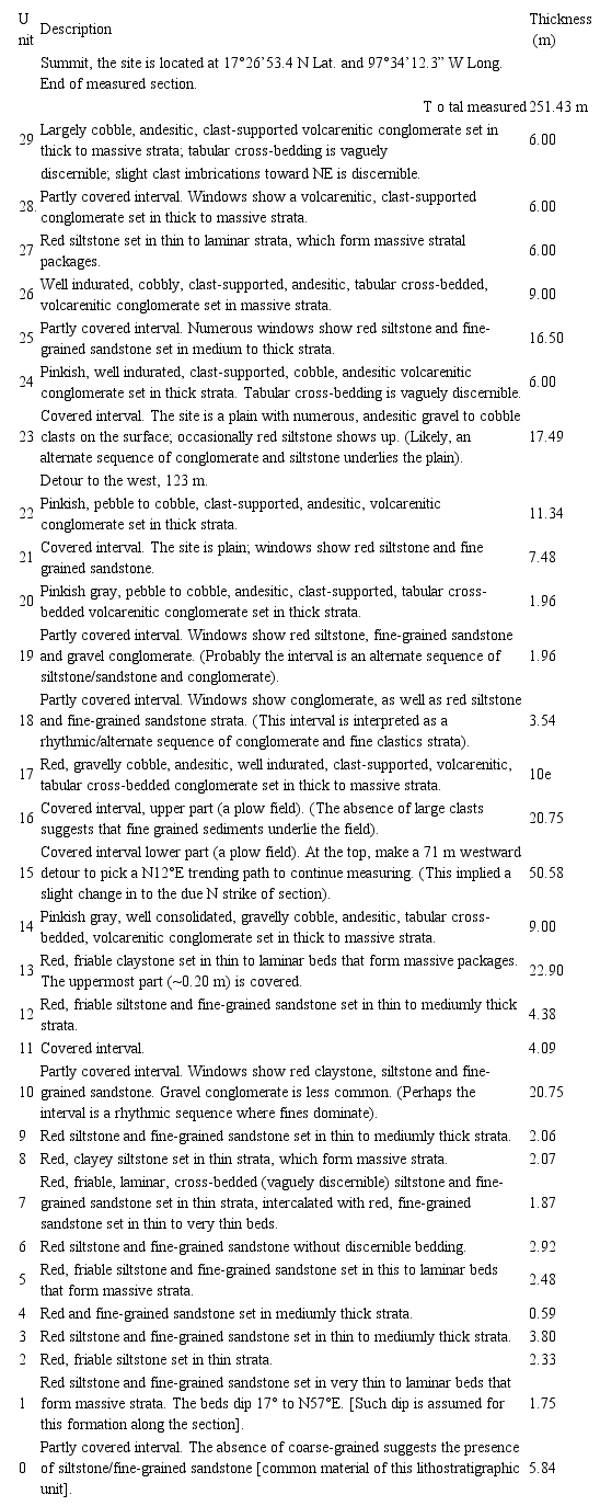 The Section starts at a site located at 17°26’ 51.3” N Lat. and 97°34’35.1” W Long. by the road to Rancho Ara; it strikes due east; the unit dips 12° to S70° East.