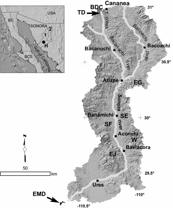 Along the Sonora river upper basin there are several zones characterized by hydrothermal alteration or mineralization, which form part of the geochemical background. Hence, some of them include currently active mines while many others deposits are unexploited or underwent production. Figure 1 shows, from north to south, the main mining developments, which correspond to the Cu-Mo Buenavista del Cobre, the Pb-Zn El Gachi, the Ag (Au) Santa Elena, the Pb-Zn (Au) San Felipe, the tungsten El Jaralito and the Cu-W-Mo Washington mining sites.