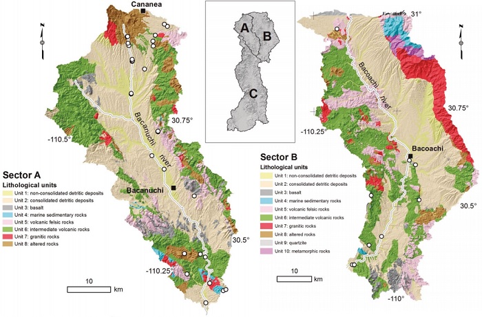 The Sonora river upper basin was divided into three sectors, which correspond to the three main sub-basins (inset of Figure 2): (i) Sector A (1479 km2) corresponds to the watershed drained by the Tinajas creek, which received the spill in first instance, and the Bacanuchi river; (ii) Sector B (2278 km2) corresponds to the Bacoachi river sub-basin, and (iii) Sector C, which is the largest and southernmost sub-basin (5535 km2), and receives discharges from sectors A and B. Considering the lithological categorization, a total of 73 rock samples were selected to perform the geochemical studies (Figure 2).