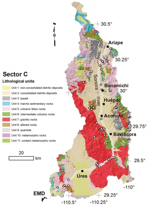 One of the issues in the agreement was the establishment of a natural geochemical background, which is absolutely necessary to quantify the possible impact of the spill to ecosystems. Even though Mexico has developed important mining activities since the 16th century, as far as we know, there is no published information regarding the natural background from rocks. However, there are some works regarding the geochemical composition of soils and sediments determined at regional scale in mining districts of Mexico, which include both natural background and baseline levels (Chiprés et al., 2008; 2009; Gutiérrez et al., 2012; Miranda-Avilés et al., 2012). The main reason for that is because it is quite difficult to discern from pristine soils and sediments from those that were impacted by human activity (Chiprés et al., 2009). This is particularly critical for the study area, since large scale to artisanal mining activity, also including mining wastes from historical mining operations is widespread along the Sonora river basin. Moreover, soils and sediments must be highly affected by agricultural and cattle industry, which is a primary economic activity in the region. Thus, the aim of this research is to establish the natural geochemical background from rocks exposed along the basin. This natural background will allow discriminating between the original geochemical signatures from that modified by anthropogenic contributions, in favor of more properly assess environmental impacts in the region.